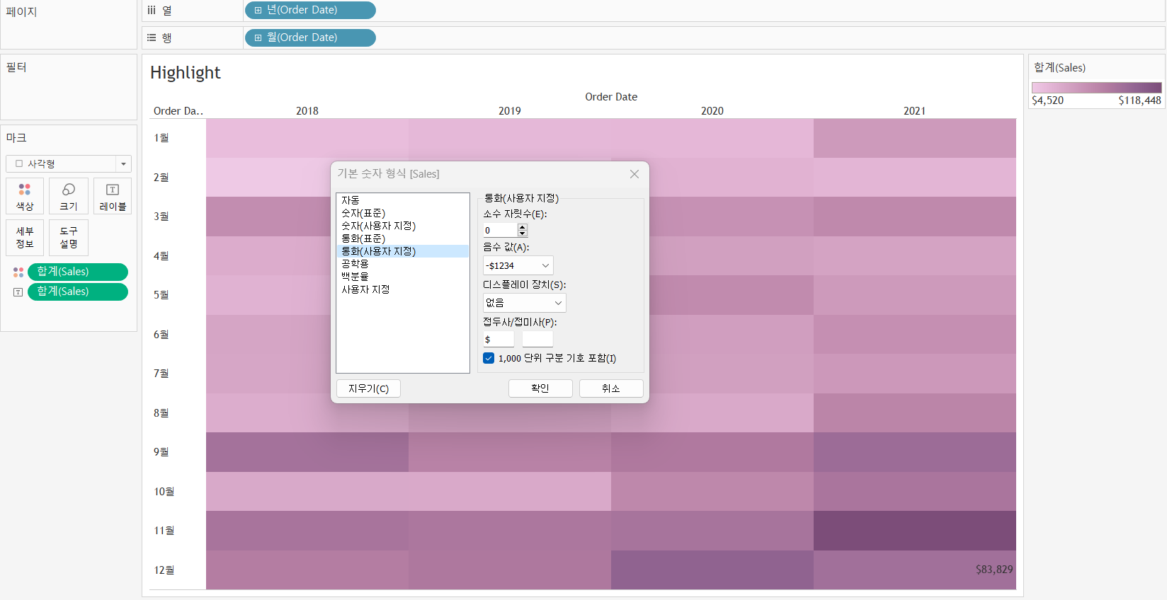 5. Sales 우클릭 → 기본 속성 → 숫자형식 들어가서 통화(사용자 지정으로 변경) 후 $로 변환