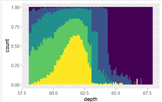 ggplot(diamonds,aes(depth))+geom_histogram(aes(fill=cut),position='fill')