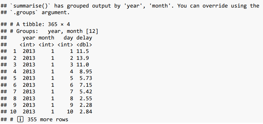 summarise(by_day, delay = mean(dep_delay, na.rm = TRUE))