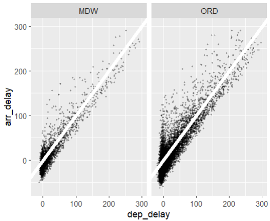 - Chicago %>% ggplot(aes(dep_delay, arr_delay)): 여기서 %>%는 파이프 연산자로, 왼쪽의 결과를 오른쪽 함수의 첫 번째 인자로 전달합니다. ggplot(aes(dep_delay, arr_delay)) 함수는 'Chicago' 데이터셋에서 'dep_delay'(출발 지연 시간)와 'arr_delay'(도착 지연 시간) 컬럼을 각각 x축과 y축으로 설정하고 그래프를 생성하는 작업을 시작합니다.