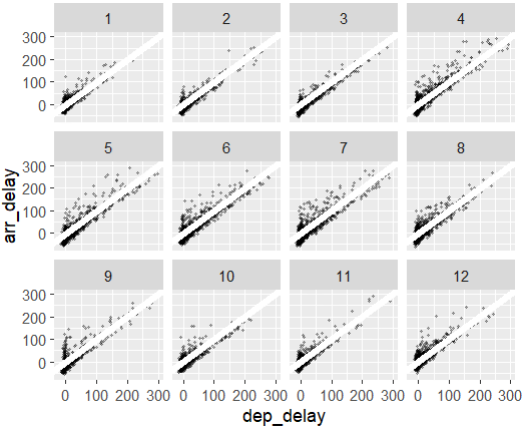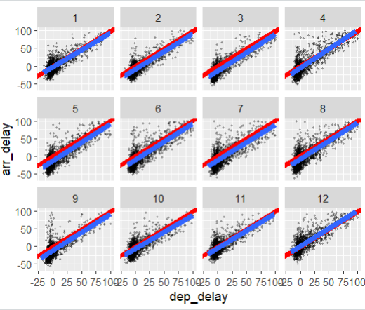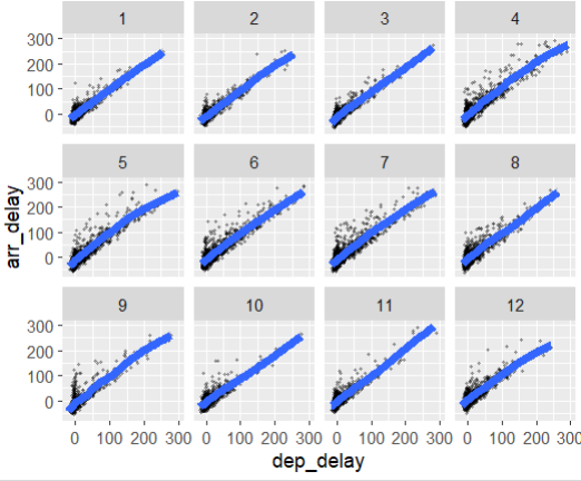 → 'Chicago' 데이터셋에서 출발 지연 시간과 도착 지연 시간 간의 관계와 추세선을 월별로 살펴보고자 하는 것입니다.