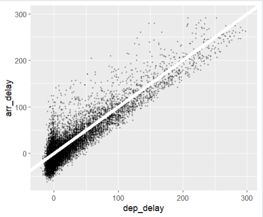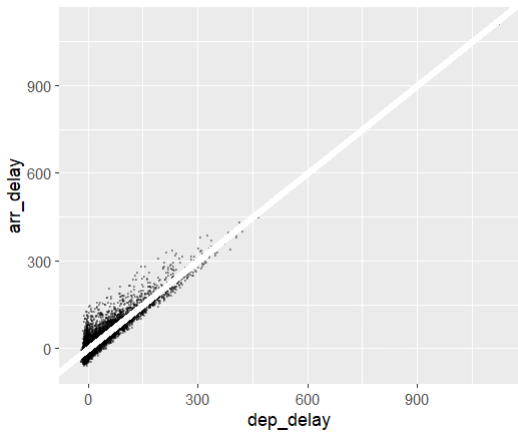 - geom_abline(intercept=0, slope=1, color="white", linewidth=2): 이 부분은 그래프에 직선(y = x)을 추가하는 작업을 수행합니다(즉, 출발 지연 시간이 도착 지연 시간과 같다는 가정). 여기서 intercept=0와 slope=1은 직선의 절편과 기울기를 설정하며, color="white"와 linewidth=2는 직선의 색상과 두께를 설정