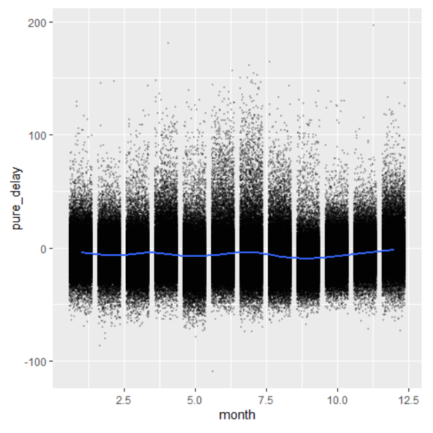 ggplot(aes(month,pure_delay))+geom_jitter(alpha=0.2,size=0.2)+