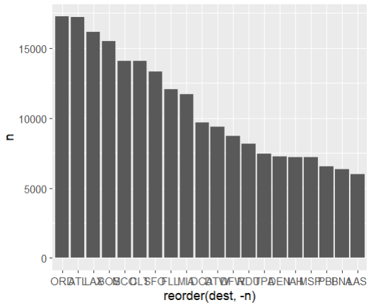 ggplot()+geom_bar(aes(reorder(dest,-n),n),stat="identity")