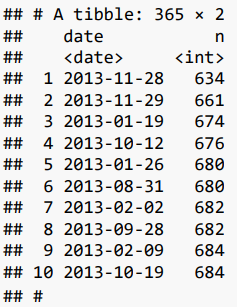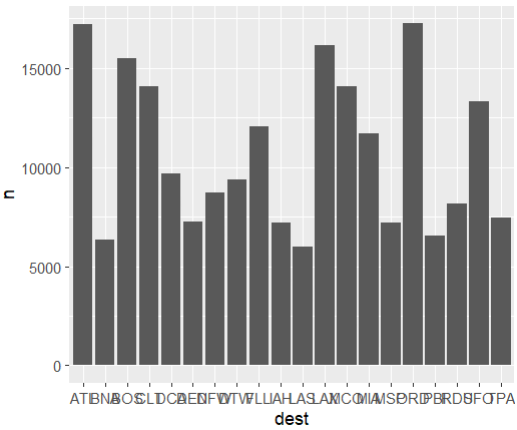 - count(dest) : flights 데이터셋에서 dest(목적지) 칼럼의 각 값의 빈도수 계산