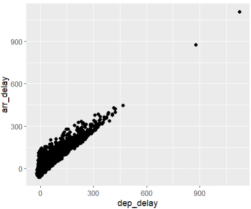 - dep_delay 와 arr_delay 관계 살펴보기