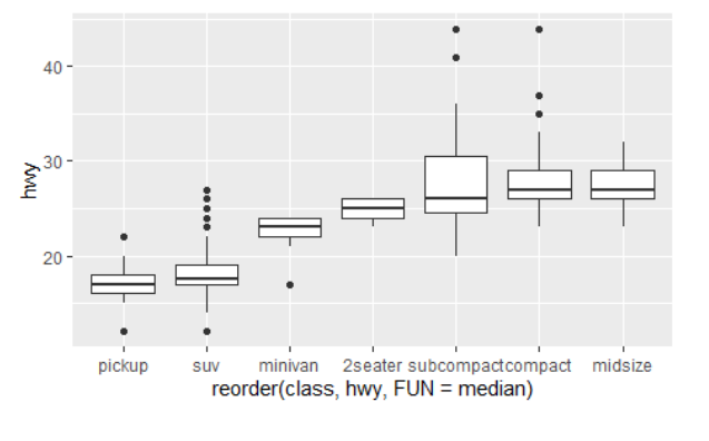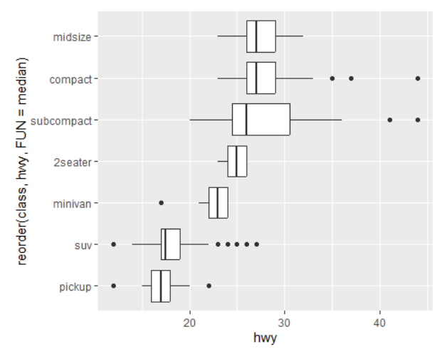 - geom_boxplot(mapping = aes(x = reorder(class, hwy, FUN = median), y = hwy))