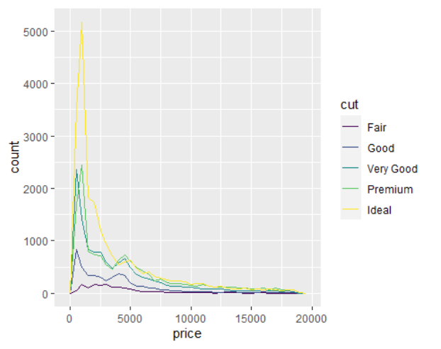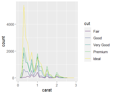 geom_freqpoly(mapping = aes(colour = cut), binwidth = 500)