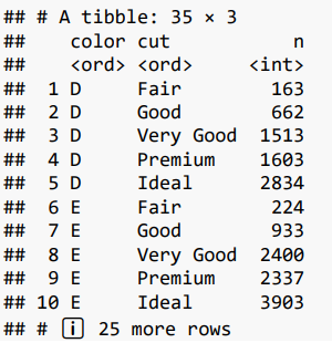 → diamonds 데이터셋을 cut 변수를 기준으로 그룹화하고, 각 컷별로 데이터셋에 포함된 다이아몬드의 개수를 계산하는 작업을 수행