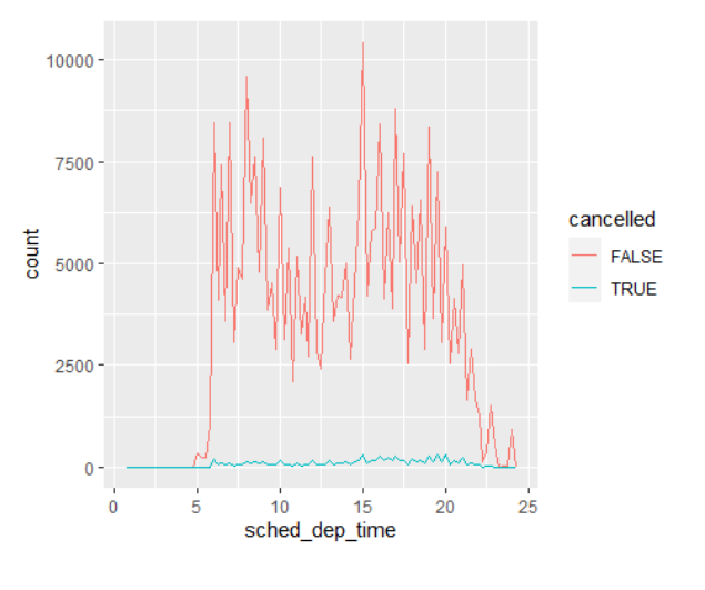 → nycflights13 패키지의 flights 데이터셋을 사용하여 새로운 변수를 추가한 후, sched_dep_time을 x축으로 하여 빈도 다각형을 그리는 작업을 수행합니다. cancelled 변수에 따라 다른 색상으로 표시되며, 막대 폭은 1/4로 설정