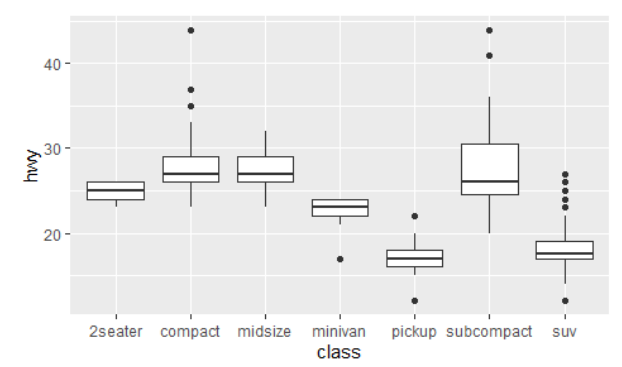 ggplot(data = mpg, mapping = aes(x = class, y = hwy)) +