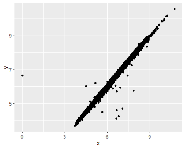 ggplot(data = diamonds2, mapping = aes(x = x, y = y)) +