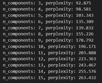 print(f'n_components: {i}, perplexity: {pv:0.3f}')
