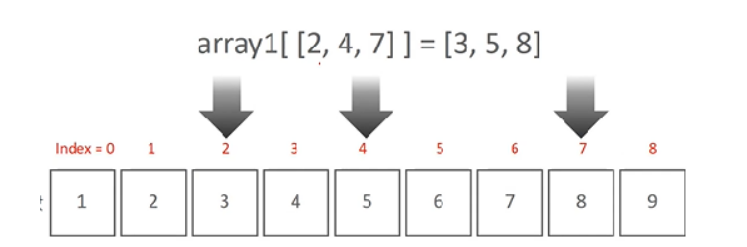 - 팬시 인덱싱 fancy indexing: 일정한 인덱싱 집합을 리스트 또는 ndarray 형태로 지정해 해당 위치에 있는 ndarray를 변환
