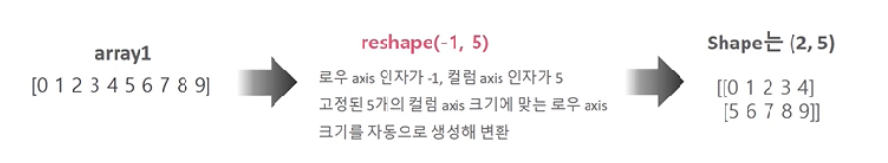 - reshape(-1,5)와 같이 인자에 -1을 부여하면 -1에 해당하는 axis의 크기는 가변적이되어 -1이 아닌 인자값에 해당하는 zix크기는 인자값으로 고정하여 ndarray의 shape를 변환