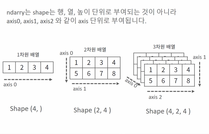 - ndarray내의 데이터 값은 숫자값, 문자열값, 불값 모두 가능