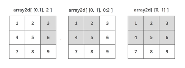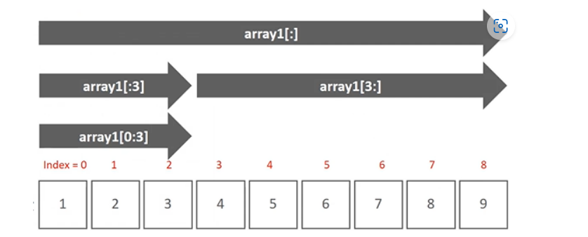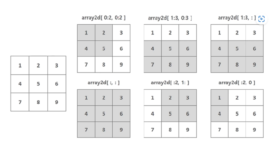 - 슬라이싱 slicing: 연속된 인덱스상의 ndarray를 추출하는 방식