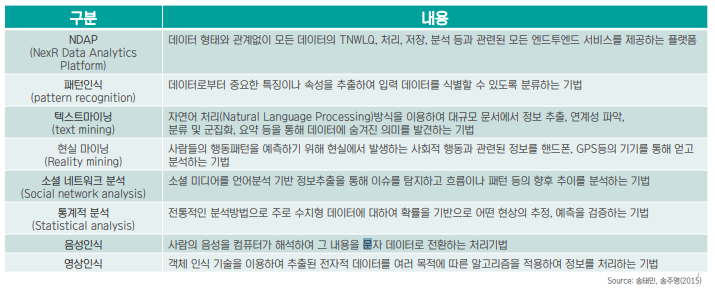 NDAP, 패턴인식, 텍스트마이닝, 소셜 네트워크 분석, 통계적 분석, 음성인식, 영상인식