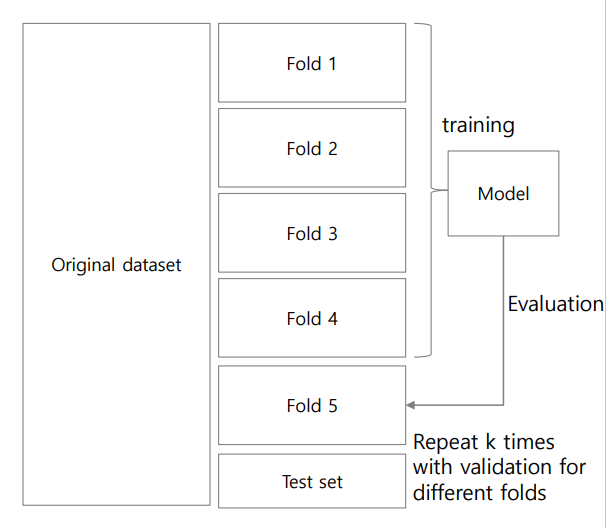 2) Leave-one-out : 데이터가 극단적으로 50개 정도로 적을 때, 49개 학습 후 1개로 평가하는 것을 말함.