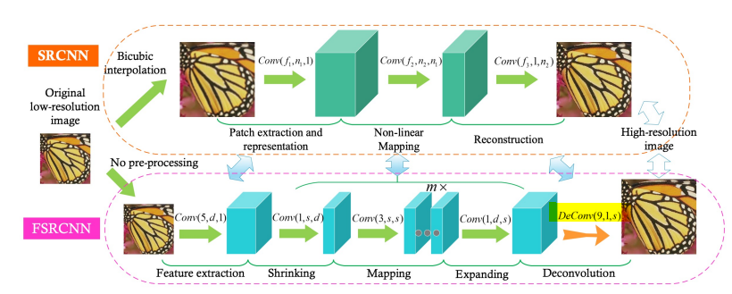 FSRCNN은 저해상도 이미지를 CNN에 직접 입력하고, 네트워크의 마지막 부분에서 이미지의 크기를 확대합니다.