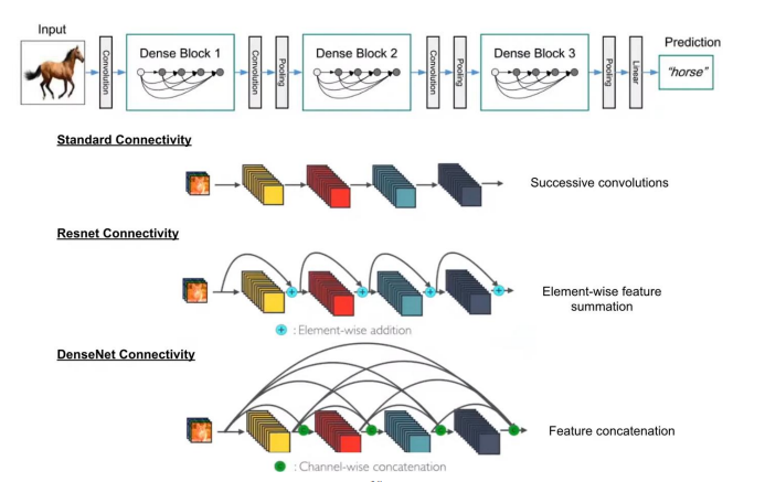 DenseNet은 2016년에 개발된 딥러닝 신경망 구조입니다. DenseNet은 밀집 연결(dense connectivity)이라는 개념을 도입하여 네트워크의 각 레이어가 이전 모든 레이어와 직접 연결되도록 설계되었습니다.