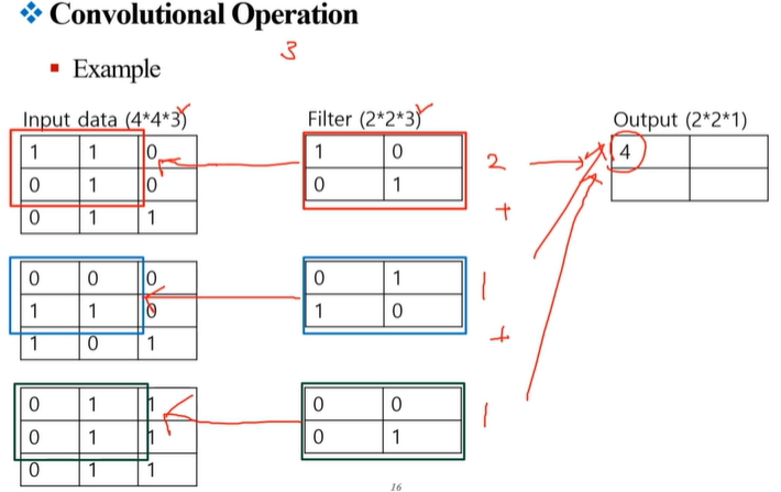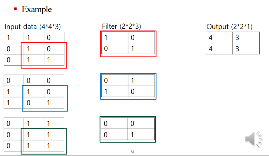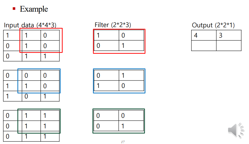 최종적으로, 필터가 전체 입력 데이터 위를 이동하면서 요소별 곱셈과 합을 통해 결과적으로 2x2x1 크기의 출력을 생성합니다. 이 과정을 통해 입력 이미지의 특징을 감지하고 이를 기반으로 새로운 특징 맵을 생성합니다.