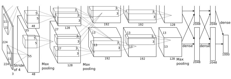 이는 ImageNet Large Scale Visual Recognition Challenge에서 매우 높은 정확도로 우승하여 딥러닝의 발전을 이끌었습니다. AlexNet은 LeNet과 유사한 구조를 가지고 있지만 훨씬 더 깊고 넓은 신경망으로 구성되어 있습니다. 이 모델은 여러 개의 컨볼루션 레이어와 풀링 레이어, 그리고 완전 연결된 레이어로 구성되어 있으며, ReLU(Rectified Linear Unit) 활성화 함수를 사용하여 비선형성을 도입했습니다. 또한 드롭아웃(dropout)과 데이터 증강(data augmentation)과 같은 기법을 사용하여 과적합을 방지하고 일반화 성능을 향상시켰습니다. AlexNet은 딥러닝 분야에서 컨볼루션 신경망의 급격한 발전을 이끈 중요한 모델 중 하나로 인정받고 있습니다.