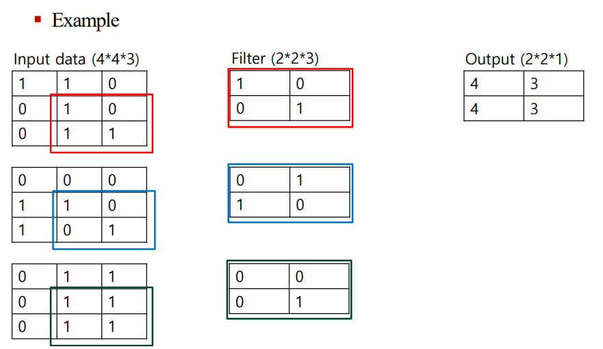 이 이미지에서 빨간색, 파란색, 녹색 박스는 필터가 입력 데이터 위에서 어떻게 이동하는지를 보여줍니다. 각각의 박스는 필터가 적용되는 입력 데이터의 다른 영역을 나타내며, 출력은 필터가 이 영역들 위를 이동하며 생성된 값들입니다.