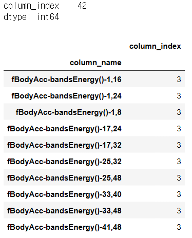 전체 피처명에서 10개만 추출: ['tBodyAcc-mean()-X', 'tBodyAcc-mean()-Y', 'tBodyAcc-mean()-Z', 'tBodyAcc-std()-X', 'tBodyAcc-std()-Y', 'tBodyAcc-std()-Z', 'tBodyAcc-mad()-X', 'tBodyAcc-mad()-Y', 'tBodyAcc-mad()-Z', 'tBodyAcc-max()-X']
