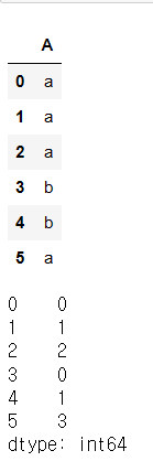 df = pd.DataFrame([['a'], ['a'], ['a'], ['b'], ['b'], ['a']], columns=['A'])