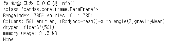 - 레코드로 561개 피처, 피처 전부 float형 → 인코딩 수행 안해도 됨 확인