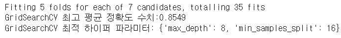 GridSearchCV 최적 하이퍼 파라미터: {'max_depth': 8, 'min_samples_split': 16}