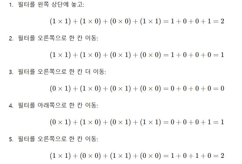 - Convolutional Layer에서 사용하는 커널(또는 필터)은 입력 이미지에서 특징을 추출하는 역할을 합니다. 커널은 작은 행렬로, 입력 이미지에 슬라이딩 윈도우 방식으로 적용되어 지역적인 패턴(에지, 코너 등)을 감지합니다. 각 커널은 특정 특징을 학습하며, 여러 개의 커널을 사용하여 다양한 특징 맵을 생성합니다.