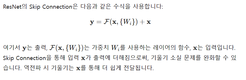 - ResNet(Residual Network)에서 사용되는 Skip Connection의 목적은 신경망이 깊어질수록 발생할 수 있는 기울기 소실(vanishing gradient) 문제를 해결하는 것입니다. Skip Connection은 입력을 출력에 직접 더해주는 방식으로, 기울기가 역전파될 때 더 쉽게 전달되도록 도와줍니다. 이는 네트워크가 더 깊어져도 성능이 저하되지 않게 하며, 학습이 더 안정적으로 이루어지도록 합니다.