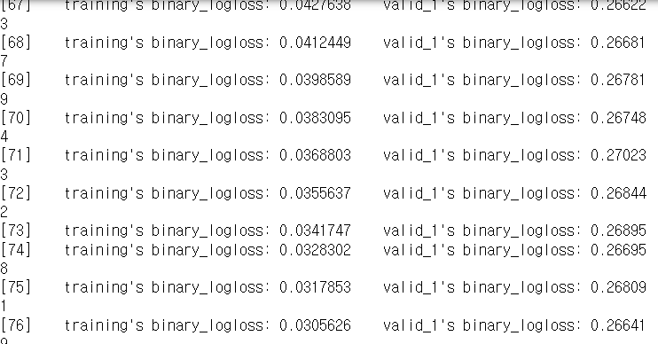 lgbm_wrapper.fit(X_tr, y_tr, early_stopping_rounds=50, eval_metric="logloss",
