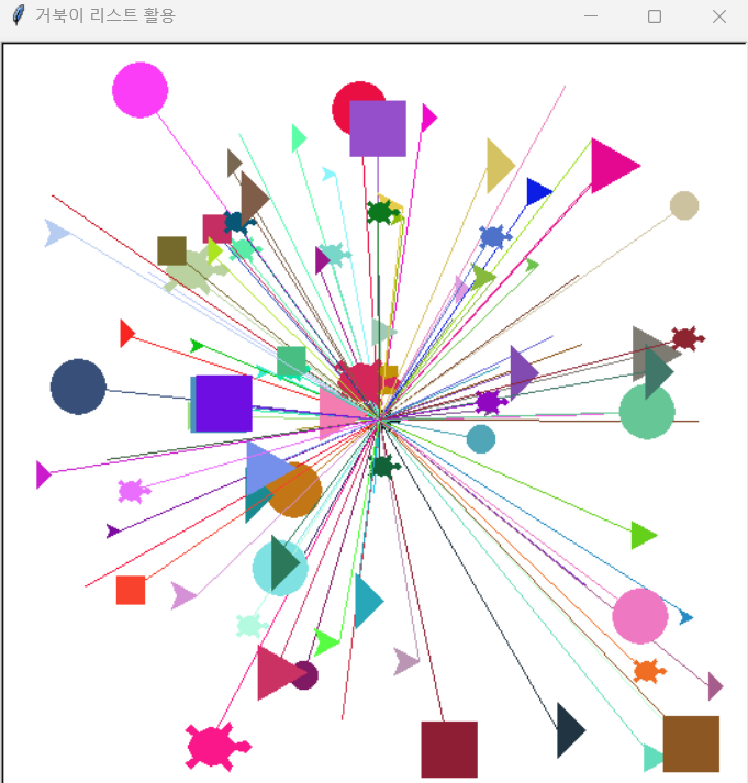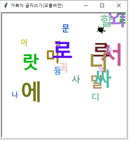 # 거북이 글자쓰기 import random from tkinter.simpledialog import * def getString() : retStr = '' retStr = askstring('문자열 입력', '거북이 쓸 문자열 입력') return retStr def getRGB() : r, g, b = 0, 0, 0 r = random.random() g = random.random() b = random.random() return(r, g, b) def getXYAS(sw, sh) : x, y, angle, size = 0, 0, 0, 0 x = random.randrange(-sw / 2, sw / 2) y = random.randrange(-sh / 2, sh / 2) angle = ran..