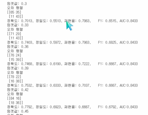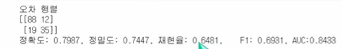 print('정확도: {0:.4f}, 정밀도: {1:.4f}, 재현율: {2:.4f},\