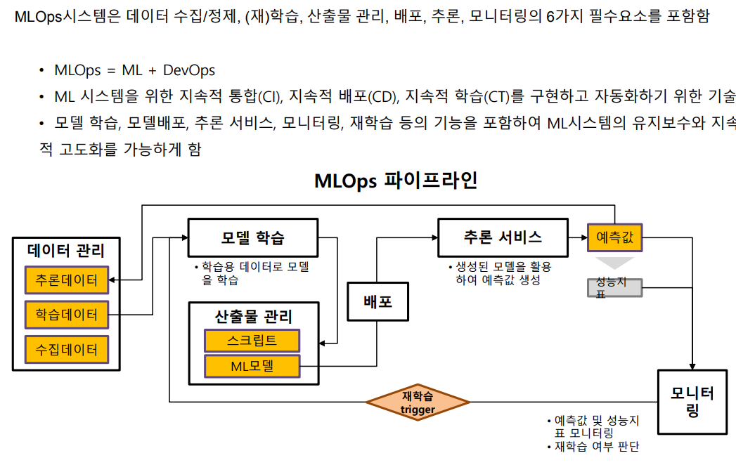 LG CNS 김진수 전문위원/ D&A 사업부 D&A 플랫폼 기술담당 - 석유화학 사업부 공통모델 개발 및 확산 - 설비 모니터링 시스템 개발 - 디스플레이 패널 품질검사 자동화 - 스마트제어 자세판정 시스템 개발 - 식수예측 - 전략 강화를 위한 빅데이터 분석 1. 데이터 분석 프로젝트 사례 MLOps란? MLOps란 머신 러닝(Machine Learning)과 운영(Operations)을 합친 용어로 프로덕션 환경에서 머신 러닝(ML) 모델이 지속적이고 안정적으로 배포되도록 유지, 관리, 모니터링 해주는 것입니다. MLOps는 머신러닝 모델 개발과 운영을 통합해 ML 시스템을 자동으로 유지, 관리, 운영합니다. MLOps의 대상은 머신 러닝 모델을 개발하는 것뿐만 아니라 데이터를 수집하고 분석하는 단계..